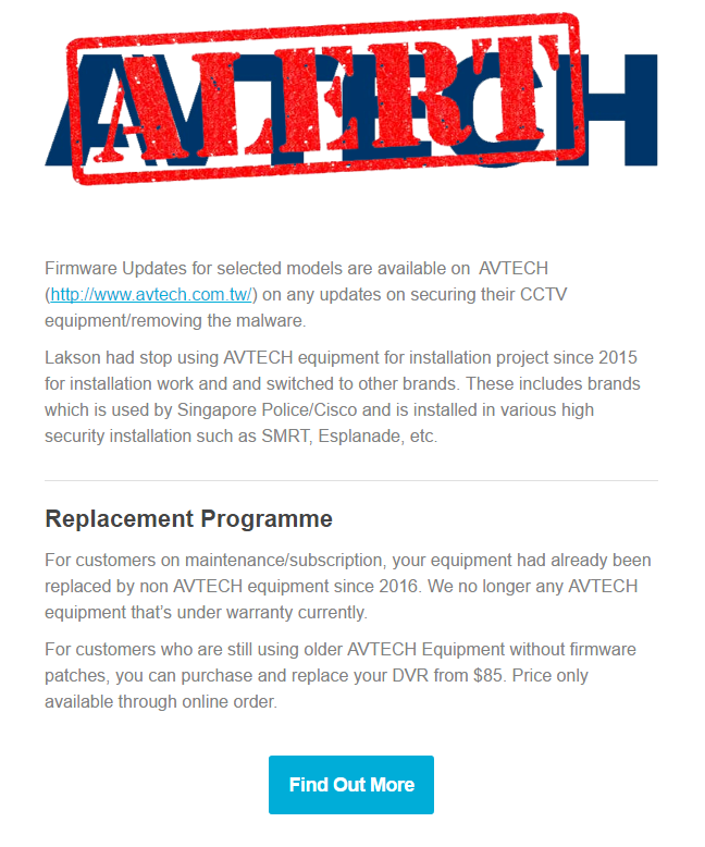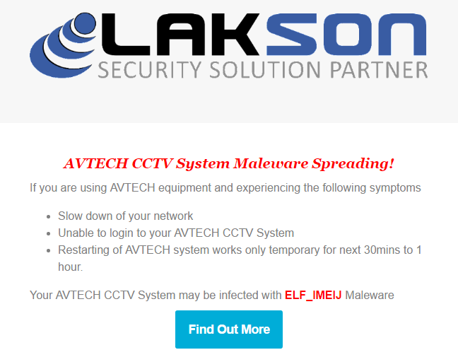 Information, LatestNewsAVTECH HACKED (Email Alert 20 March 2017) Posted on March 20, 2017April 2, 2017 by lakson.com.sg 20 Mar lakson.com.sg Guide to Remove Malware from Infected AVTECH Devices AVTECH CCTV System Maleware Infection