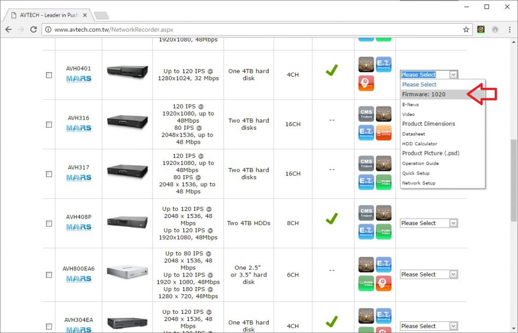 We had compiled a list of old AVTECH Firmware for the older discontinued models. You can download them here. Do note these firmware are not updated firmware with the security fix. You have to disconnect the system from the network after reloading the firmware. Otherwise they’ll still get infected again.) - If your model is listed, visit the Product Page , e.g. http://www.avtech.com.tw/NetworkRecorder.aspx, and download the firmware listed beside your model. We’ll use AVH0401 as example.