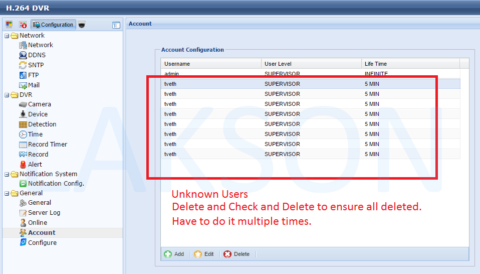 Remove them. There might be multiple users with the same username. You’ll have to repeat the delete process multiple time in order to remote all unauthorised users from the CCTV system.